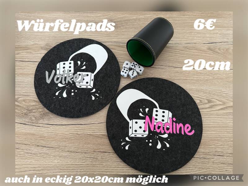 Würfelpads damit es beim Spielen nicht mehr so einen Krach macht, personalisiert mit Wunschname je Stück 6€. Viereckig auch möglich.